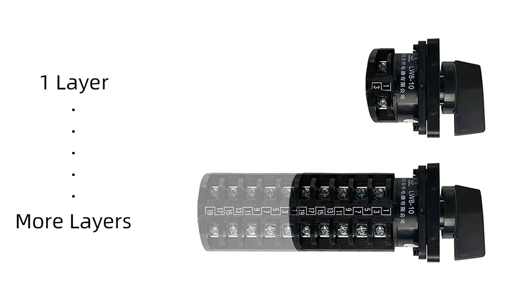 De LW8 10A roterende nokkenschakelaar met drie standen integreert functionaliteit, veiligheid en esthetiek, met de volgende opvallende kenmerken: