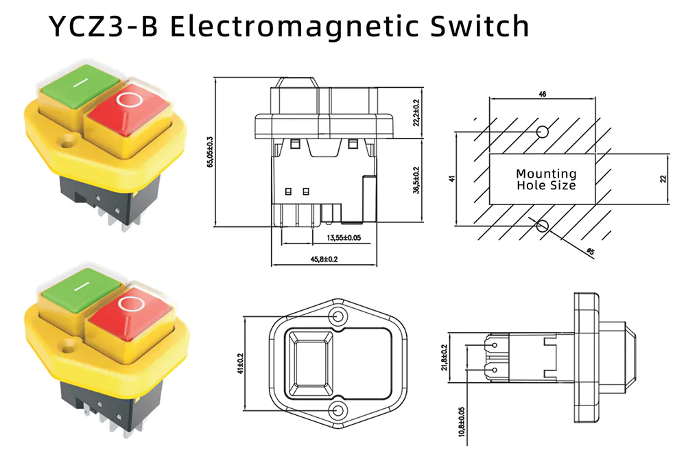 Onze 16A gele brede diamant-elektromagnetische drukknopschakelaar is ontworpen om zware industriële omgevingen te weerstaan en integreert stroomuitval- en onderspanningsbeveiligingsfuncties. Het voorkomt effectief onverwachte uitval van apparatuur en zorgt voor een stabiele, 24/7 continue werking.