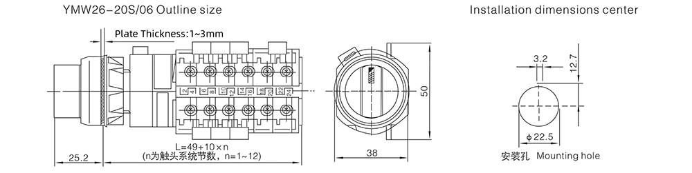 De 20A centraal gemonteerde nokkenschakelaar met één gat (intern model: YMW26-20S) is een hoogwaardige elektrische besturingscomponent die onafhankelijk is ontwikkeld door YAMING, een doorgewinterde fabrikant met 30 jaar ervaring in de elektrische schakelaarindustrie. Deze schakelaar is ontworpen voor AC 50Hz (tot 690V) en DC 240V (nominale stroom tot 20A) circuits en beschikt over een compacte structuur, betrouwbare prestaties en uitstekende aanpasbaarheid.