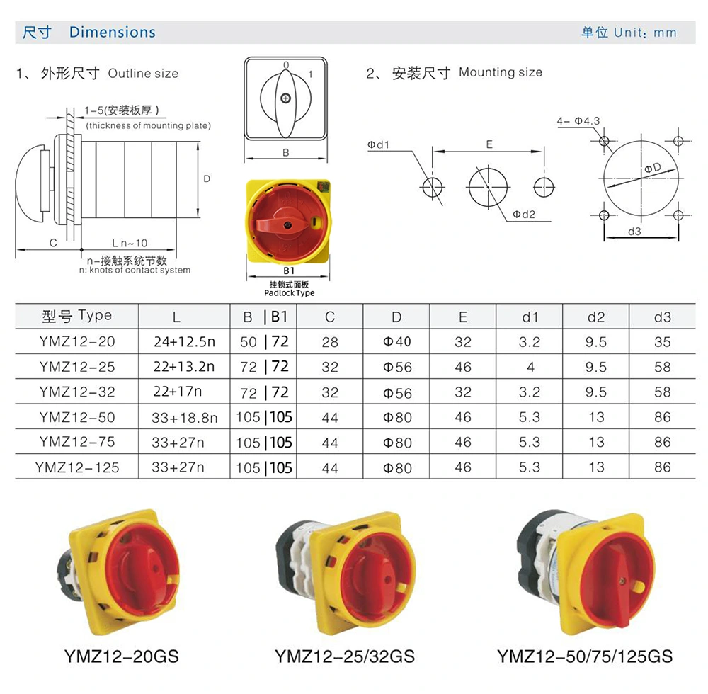 Met meer dan 30 jaar professionele expertise is Zhejiang Yaming Electric een vooraanstaande leverancier van hoogwaardige elektrische schakelaars. Door gebruik te maken van onze sterke technische kracht en een uitgebreid kwaliteitsmanagementsysteem, introduceren wij met genoegen onze 50A hangslot UIT-AAN combinatie van twee posities roterende nokkenschakelaar (interne code: YMZ12-50GS). Het beschikt over voortreffelijk vakmanschap en geavanceerde technologie en is uitgerust met antimisbruikfuncties om een stabiele en efficiënte circuitcontrole voor industriële gebruikers wereldwijd te garanderen.