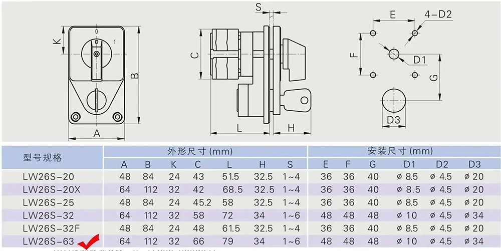 YAMING, een professionele fabrikant van elektrische schakelaars met meer dan 30 jaar diepgaande expertise, lanceert de LW26 63A Key Control Changeover Cam Switch (intern model: YMW26-63YS4) in China. Het is van toepassing op AC 50HZ-circuits met een nominale spanning ≤690V en DC-circuits met een spanning ≤240V, die een nominale stroom van 63A ondersteunen. Met een compact ontwerp, uitgebreide functies en uitstekende veiligheidsprestaties wordt het veel gebruikt bij de conversie van hoofdcircuits, directe motorbesturing, commandobesturing en meetscenario's, en kan het zich aanpassen aan verschillende zware werkomgevingen.