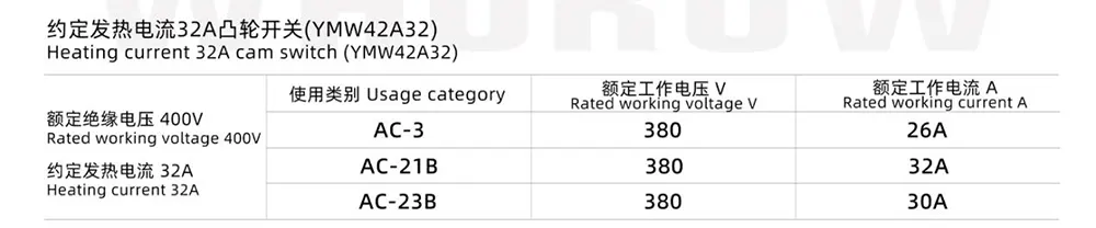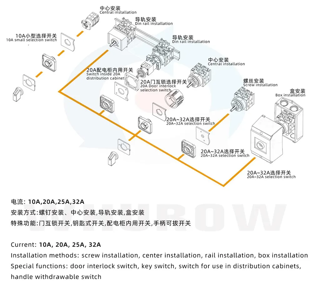 - 32A nokkenschakelaar: neemt dezelfde positioneringshoeken van 30°, 45°, 60°, 90° aan als het 20A-model, met maximaal 12 bedieningsposities en 1–12 schakellagen. Het heeft een sterker stroomdragend vermogen, geschikt voor gelegenheden met hogere stroomvereisten.